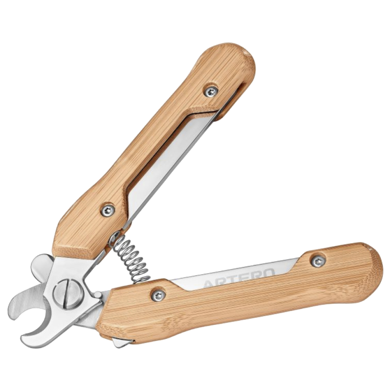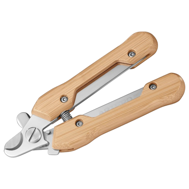 Für angenehmes Arbeiten sorgt die automatische Öffnung per Federmechanismus zwischen den Griffteilen. Ergänzt wird das Ganze durch einen Sicherheitsverschluss und einen beweglichen Sicherheitsstopp, der beim Ansetzen zusätzlich Orientierung gibt. Der Bambusgriff liegt stabil in der Hand, während die Klingen aus rostfreiem Edelstahl auf Langlebigkeit und saubere Schnitte ausgelegt sind.